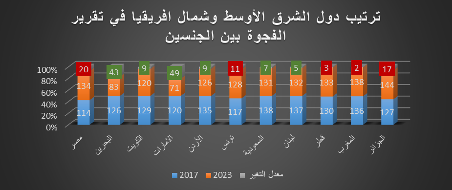 يقدم مؤشر الفجوة العالمية بين الجنسين الصادر من قِبل المنتدى الاقتصادي العالمي لقياس التقدم المحرز نحو تحقيق المساواة ومقارنة الفجوات بين الجنسين في 146 دولة، ترتيب دول الشرق الأوسط وشمال أفريقيا لعامي 2017 و2023 والذي يبين تراجع بعض الدول في المؤشر 2023 بالترتيب (مصر بـ20 مركزًا – الجزائر بـ17 مركزًا – تونس بـ11 مركزًا – قطر بـ3 مراكز – المغرب بـ2 مراكز). وتقدم بعض الدول في المؤشر بالترتيب (الإمارات بـ49 مركزًا – البحرين بـ43 مركزًا – الكويت والأردن بـ9 مراكز – السعودية بـ7 مراكز – ولبنان بـ5 مراكز).