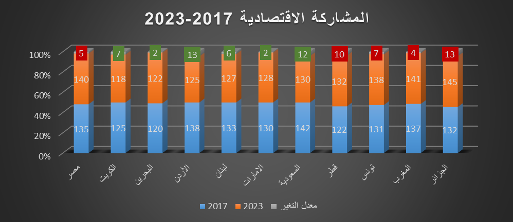 وقد تراجعت بعض الدول في مؤشر المشاركة الاقتصادية في تقرير 2023 بالترتيب (الجزائر – قطر – تونس – مصر – المغرب)، فيما كان أكثر الدول تقدمًا في تقرير عام 2017 هي: الأردن – السعودية.