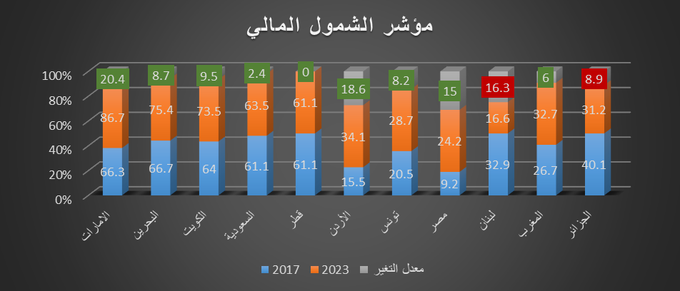 بين مؤشر المرأة والسلام والأمن تقدم غالبية المنطقة فيما يخص الشمول المالي للنساء فوق 15 عامًا واللاتي يمتلكن حسابات بنكية أو يستخدمن خدمة تحويل الأموال عبر الهاتف المحمول. ويلاحظ أن مصر في تقرير 2017 كانت تحمل أدنى المؤشرات الخاصة بالشمول المالي بنسبة قدرها 9.2%، وقد تقدم هذا المؤشر في تقرير 2023 ليبلغ 24.2% بزيادة قدرها 15%. فيما تراجعت بعض الدول الأخرى في هذا المؤشر مثل لبنان الذي تراجع بـ6.3%، والجزائر بنسبة 8.9%، ولم تحقق قطر تقدمًا في هذا المؤشر في التقريرين.