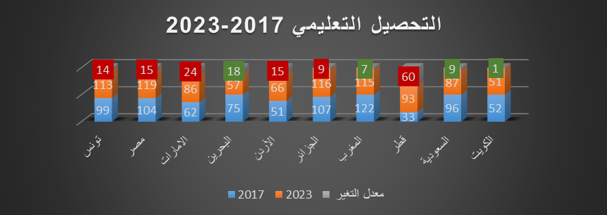 وعلى صعيد مؤشر التحصيل العلمي فقد بلغت الدول العربية المراكز التالية بالترتيب: (الكويت 51 – البحرين 57 – الأردن 66 – الإمارات 86 – السعودية 87 – قطر 93 – تونس 113 – المغرب 115 – الجزائر 116 – مصر 119).