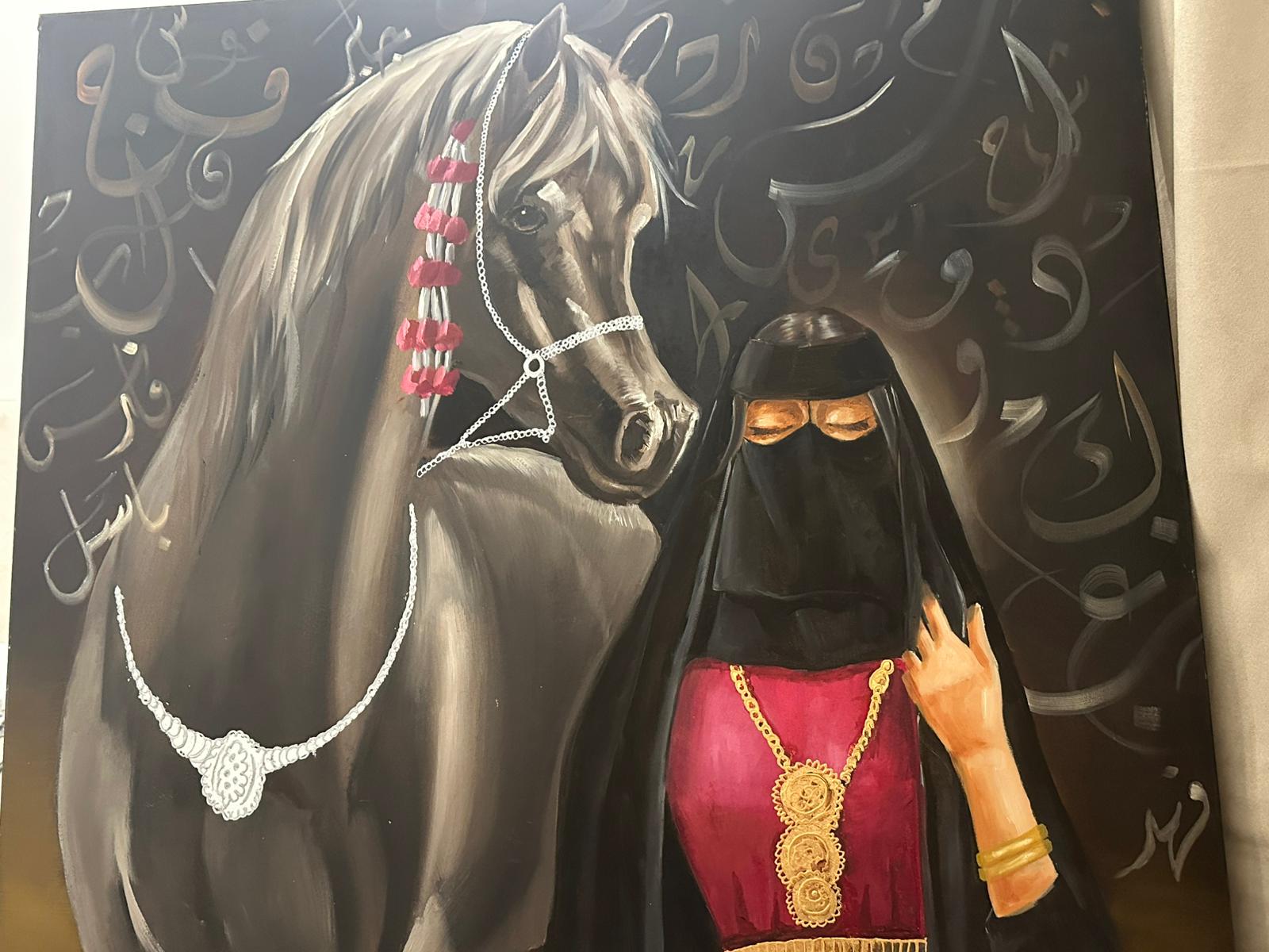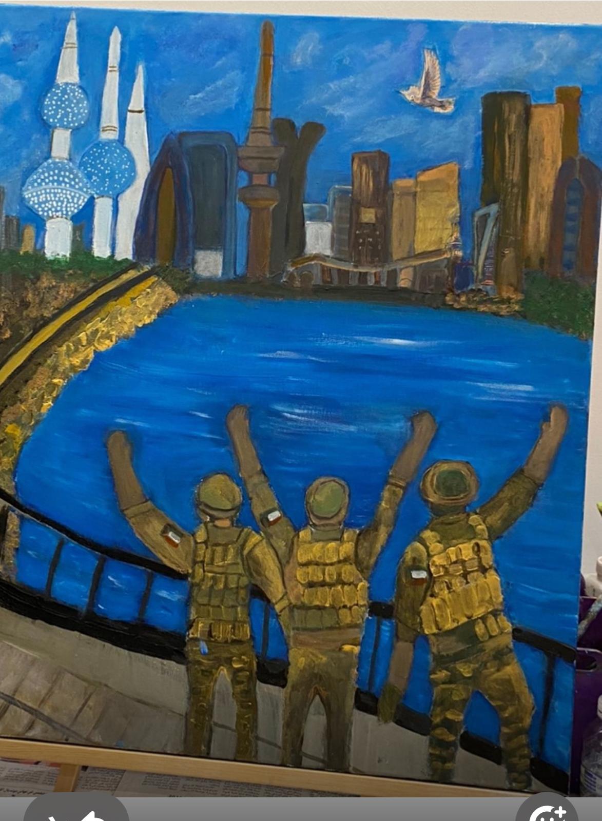 أما الفنانة نوف بديح البديح، فقد قدّمت رؤيتين متكاملتين؛ في لوحتها الأولى “أم الأبطال”، تتجلى المرأة الكويتية كقوةٍ صامتة تقف خلف الصفوف الأمامية، تدفع أبناءها نحو أداء الواجب، بينما جاءت الحروف الأبجدية متناثرة كأنها أسماء الأبطال، أو ذاكرة لا تنسى.