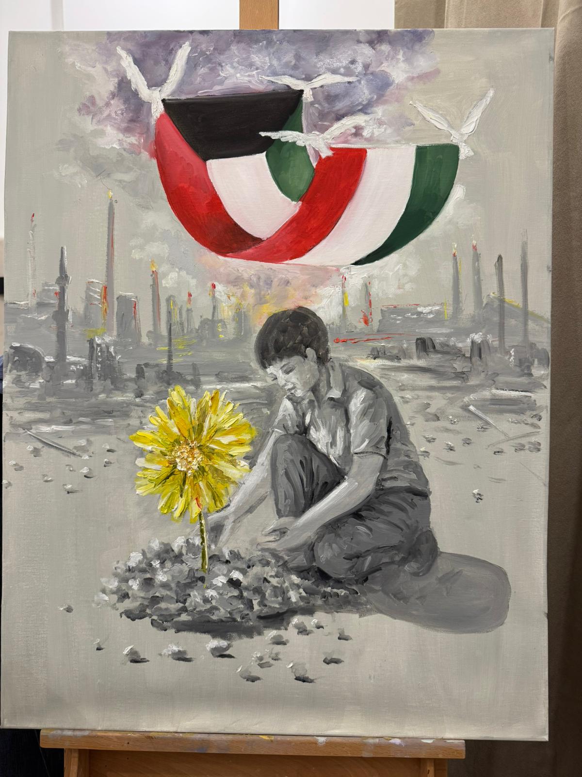 وفي لوحتها الثانية، يرتفع علم الكويت فوق مرتفعٍ شامخ، بينما ينحني طفلٌ ليزرع زهرة العرفج، في صورةٍ تختصر المستقبل؛ حيث يتعانق الأمل مع الفعل، ويظهر الجيل القادم شريكًا في بناء الوطن، لتؤكد اللوحة أن الكويت تمضي نحو الغد بروحٍ واحدة.