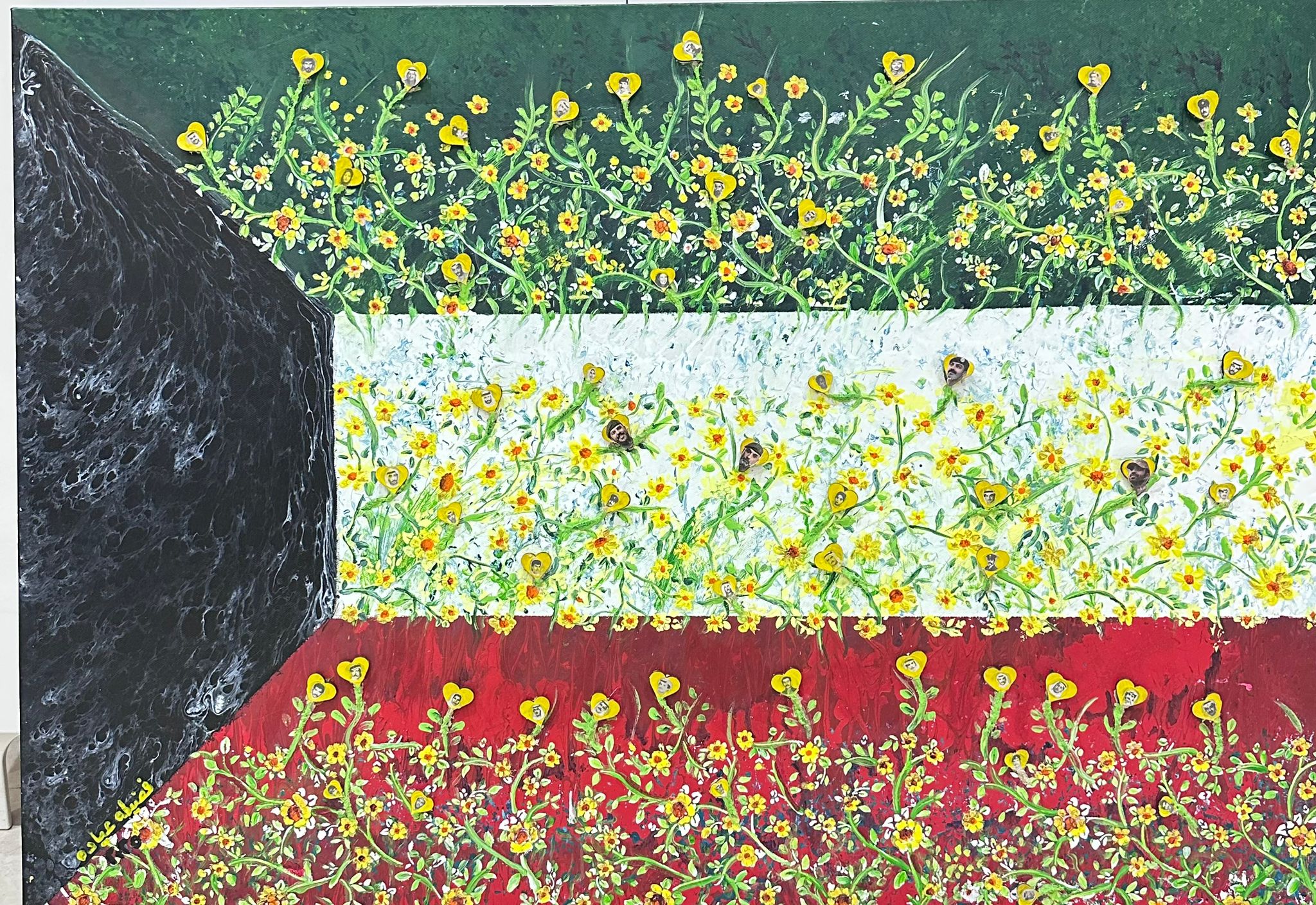 وفي عملٍ آخر، تتجلى رمزية عميقة لعلم الكويت وقد امتلأ بزهرات العرفج، تتخلله قلوبٌ تحمل صور شهداء الكويت، في مشهدٍ يجمع بين الوفاء والحياة؛ حيث يلتقي رمز الأرض مع ذكرى الشهداء، ليؤكد أن الوطن يُصان بالتضحيات، ويستمر بالأمل.