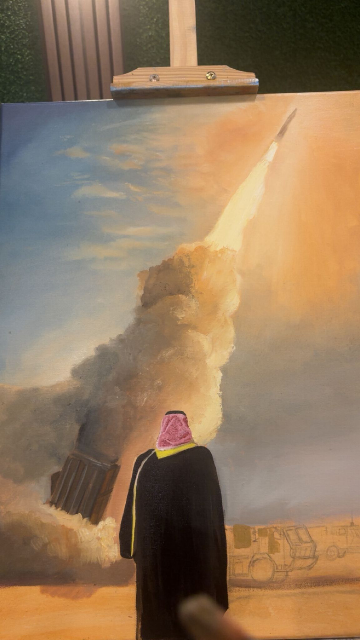 من بين الأعمال، برزت لوحة الفنانة خديجة جاسم أبو الحسن، التي جسّدت ثلاثة جنود يقفون بثبات أمام ملامح الوطن، في مشهدٍ يختصر معنى الجاهزية والقوة. لم يكن الجنود مجرد أشخاص، بل رموزًا لوطنٍ يحرس نفسه، وشعبٍ يقف خلف جيشه، مؤمنًا بأن الدفاع عن الأرض هو امتداد طبيعي للحب والانتماء.